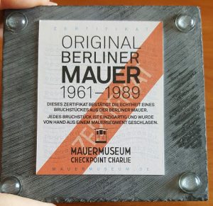 Unique Genuine Piece of the Berlin Wall mounted on Special Slate Display with Plque as shown on front Stating – “Original Berliner Mauer 1961 – 1989” and on the Rear a COA also showing that the item is Authentic – Stunning from the CheckPoint Charlie Museum Shop in Berlin – 100% Genuine.