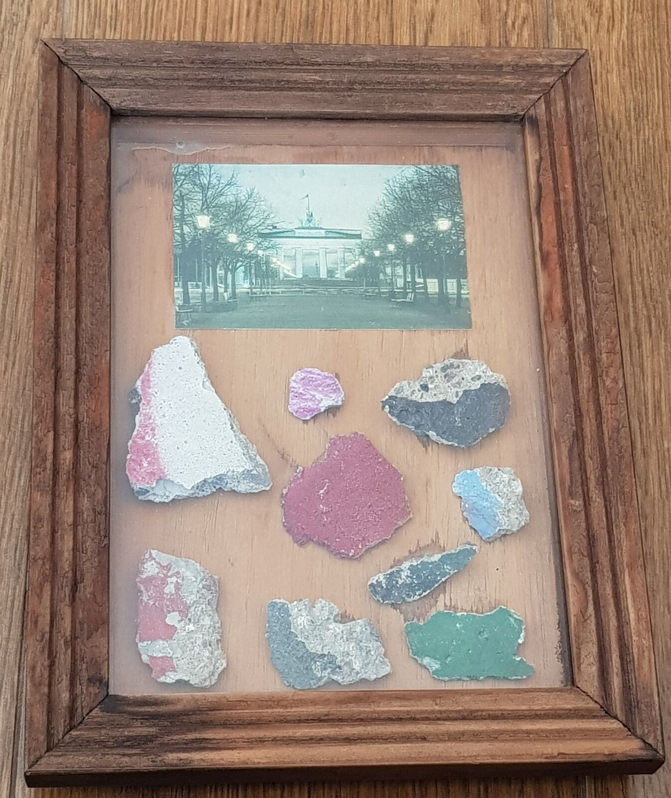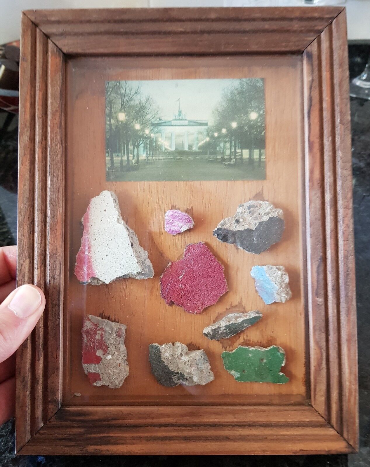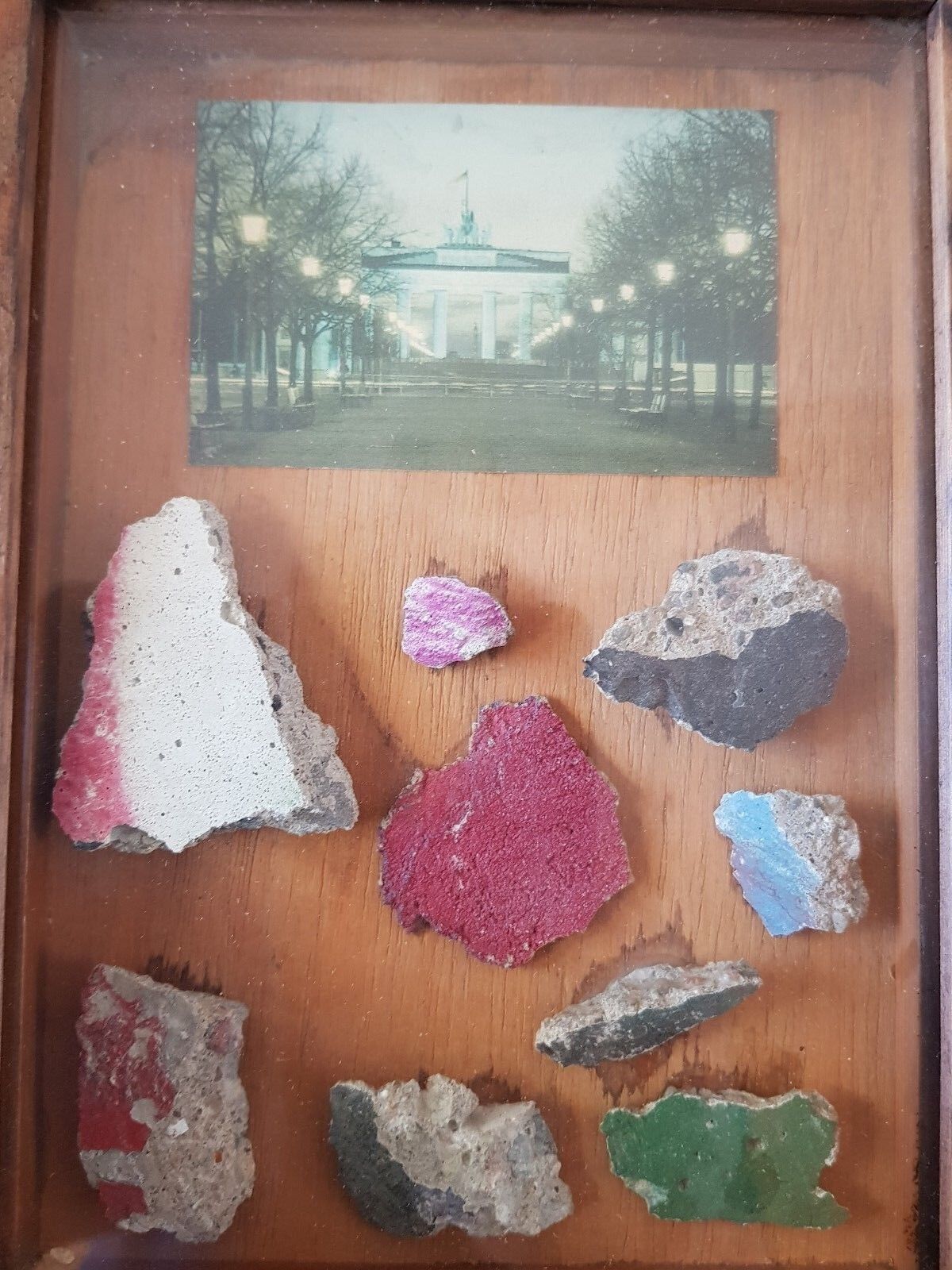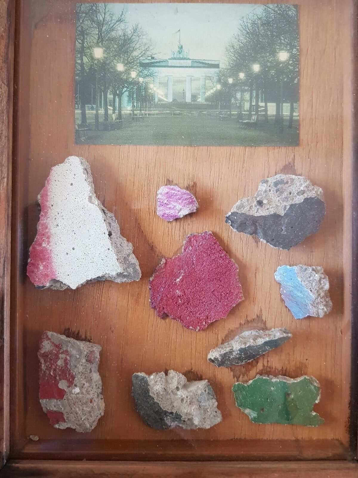 UNIQUE  GENUINE PIECES OF THE BERLIN WALL from the Wall MOUNTED IN  WOODEN DISPLAY FRAME with Glass with German Signed COA on the rear stating that these pieces  from the Wall located in front of the Brandenburg Gate in Berlin on 07.01.1990 – most unusual item .