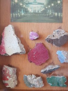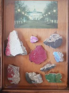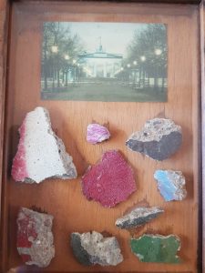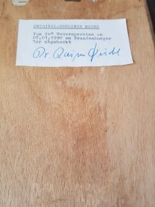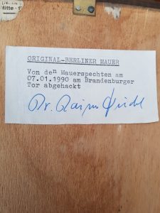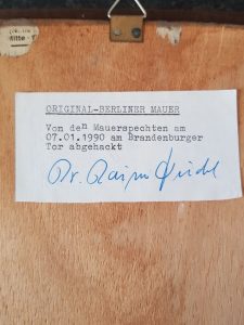 At the time of the fall of the Wall in late 1989 many local Berliners took to to chipping pieces of the wall out as pieces of memorabilia for themselves and were known as “Mauerspechte” or Woodpeckers! This lovely item came from one of these people who transformed his collection into this incredible piece