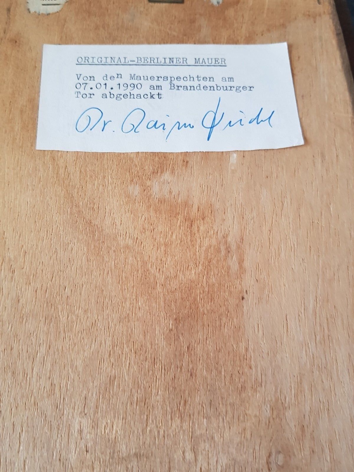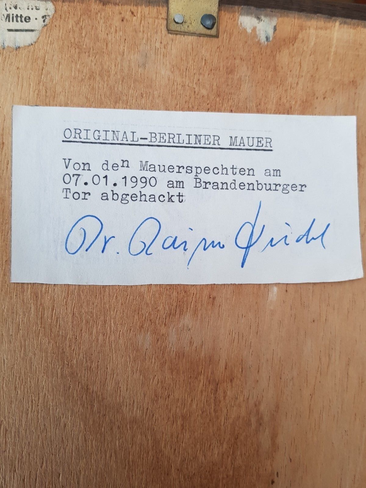 From the Concrete composition which was unique to the Berlin Wall ,we know this item is Genuine – the Berlin wall was built from a crystalline concrete structure – containing a lot of quartz and lime by which the Berlin Wall can be effectively “fingerprinted”